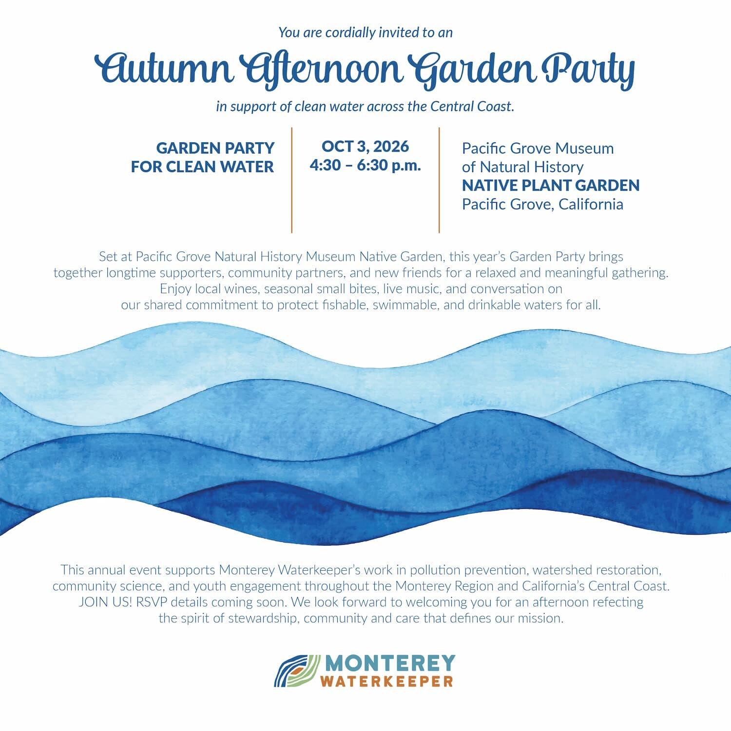 Enjoy local wines, small bites, live music, and conversations with old and new supporters of clean water. Please join Monterey Waterkeeper for our annual fundraiser on Saturday, October 3rd from 4:30-6:30pm at the Pacific Grove Museum of Natural History in the Native Plant Garden. Our leadership supporters make it possible for Monterey Waterkeeper to advance long-term solutions for clean water, protect vulnerable waterways, and ensure all communities have access to safe and affordable drinking water. Sponsorship support extends far beyond a single event – it strengthens year-round advocacy, education, and restoration efforts across the region.